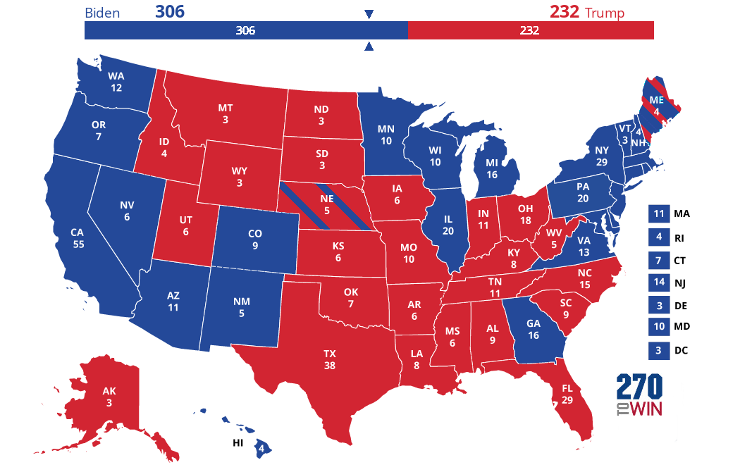However Biden didn’t quite sink to the level of the “bad day” map - he retained Nevada and made his expected gains in Nebraska’s 2nd district and Arizona, as well as gaining Georgia - expected to be more of a stretch than it actually was. Ironically his electoral college total exactly matches that of Trump in 2016.